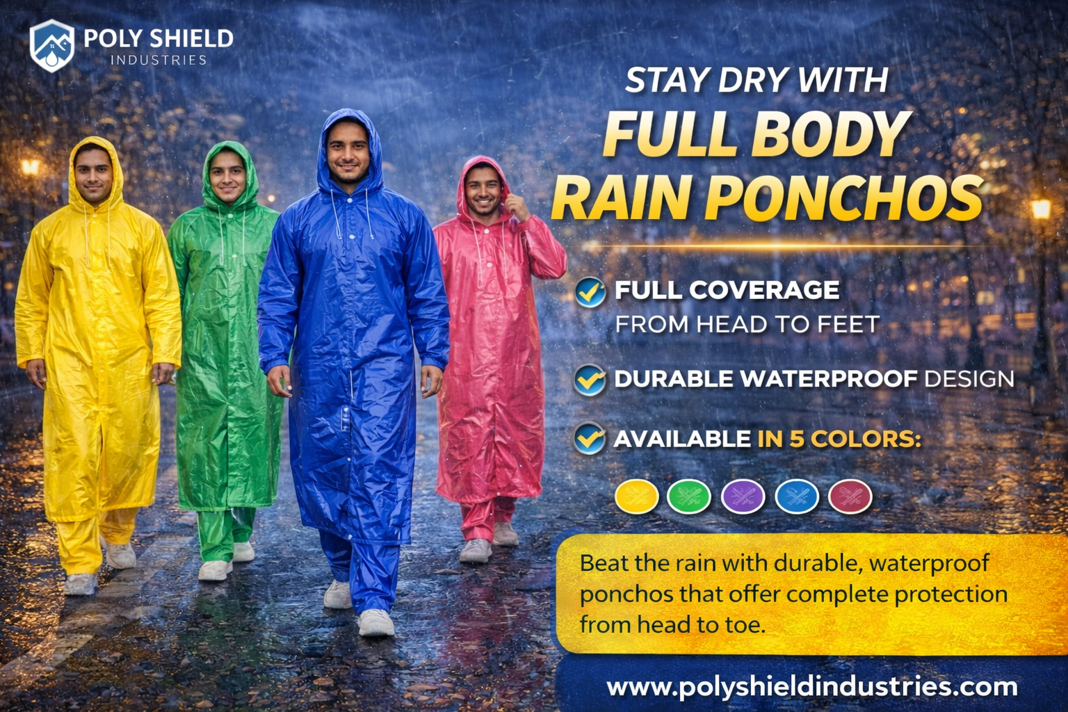 Based in Ahmedabad, Gujarat, Poly Shield Industries is a leading manufacturer of high-quality rainwear. We supply Full Body Rain Ponchos across India, offering various thicknesses and custom specifications. Whether you need lightweight disposable options or heavy-duty reusable ponchos, we have the manufacturing capacity to meet your deadlines.